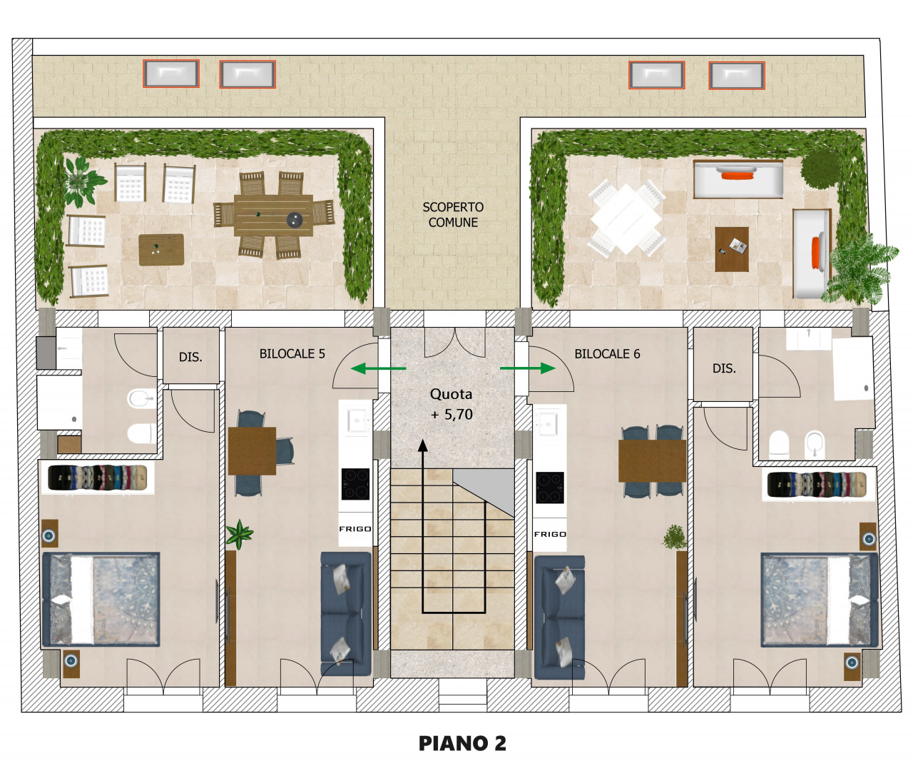 - Piano Secondo: il livello superiore si sviluppa invece in 2 bilocali, ciascuno con ampio terrazzo a livello di pertinenza esclusiva.