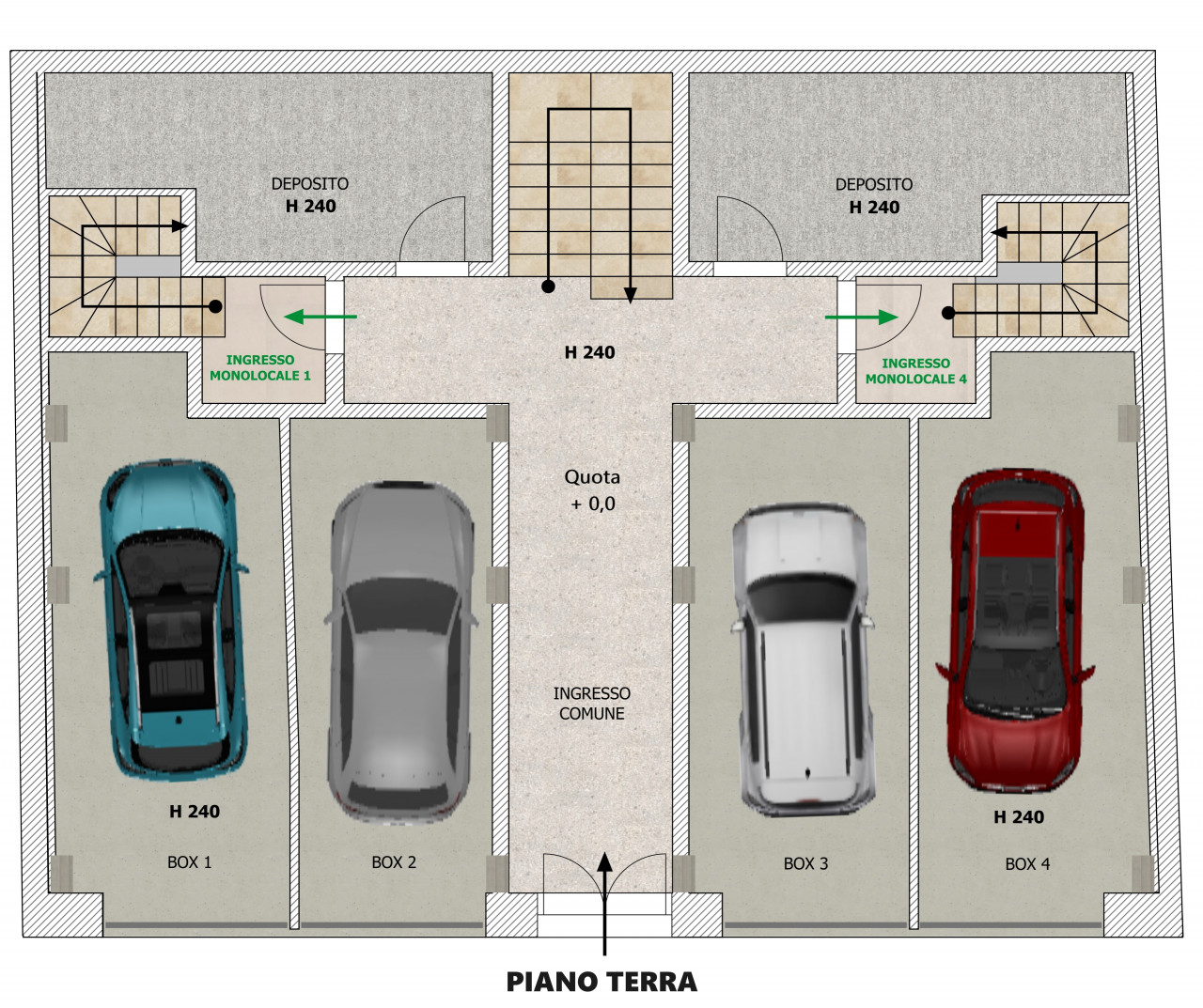 - Piano Terra: un’area che ospita ben 4 box auto e 4 locali deposito, che risponde alla nota carenza di parcheggi della zona, offrendo un valore aggiunto determinante per qualsiasi destinazione d'uso. il tutto servito da un ingresso comune che garantisce un accesso agevole e riservato al vano scala.